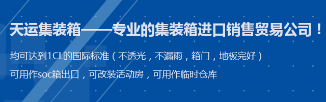 青島天運(yùn)集裝箱服務(wù)有限公司,是專(zhuān)業(yè)的集裝箱進(jìn)口銷(xiāo)售貿(mào)易公司,公司與各大船公司租箱公司保持著密切的合作關(guān)系,箱源充足,所有出售集裝箱均可達(dá)到IICL的國(guó)際標(biāo)準(zhǔn)(不透光,不漏雨,箱門(mén),地板完好)可用作soc箱出口,可改裝活動(dòng)房,可用作臨時(shí)倉(cāng)庫(kù)。